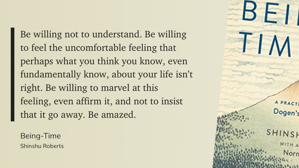 Be willing not to understand. Be willing to feel the uncomfortable feelings that perhaps what you think you know, even fundamentially know, about your life isn’t right. Be willing to marvel at this feeling, even affirm it, and not to insist that it go away. Be amazed.